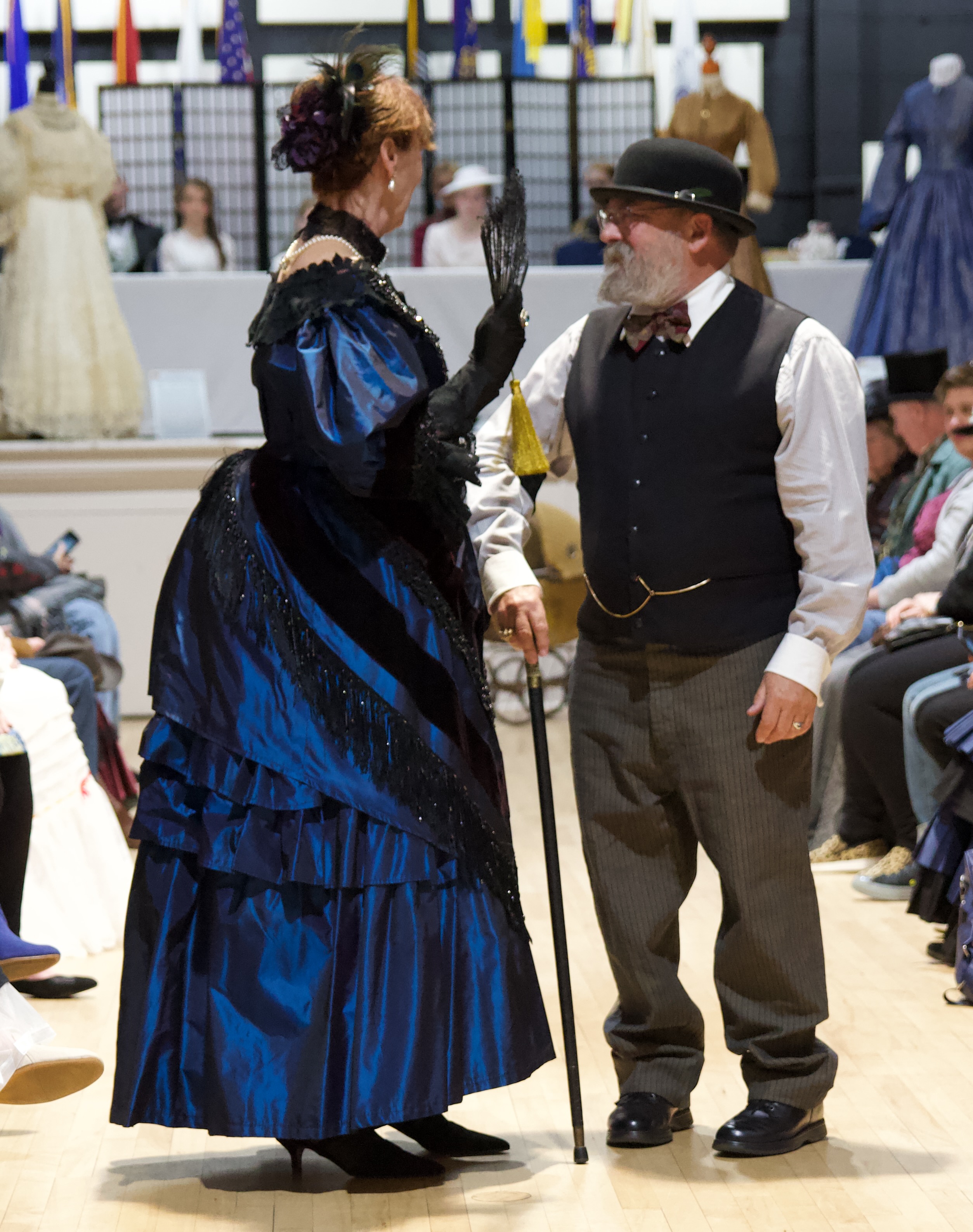 And then walking into the American Legion Hall, where most of the presentations, the contra-dance, and our fashion show are held, it looked all bright and shiny, and a display was going up on the stage of antique dresses belonging to Julie & Terry Cheetham.