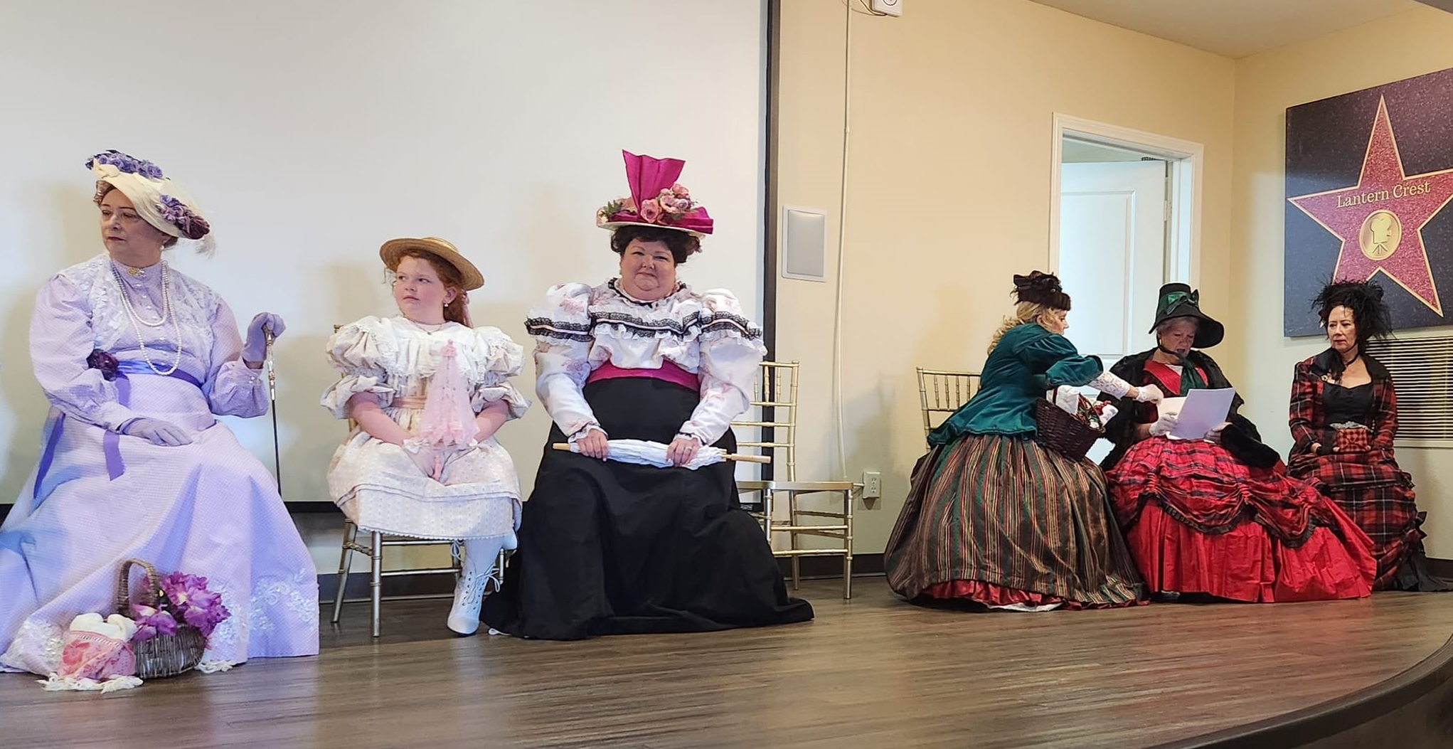 The Historical Dressers just held our 3rd fashion show for the Lantern Crest Retirement Community a week ago. The theme I wrote was Historical Dressing for the Holidays. My first idea was to wear Christmasy dresses but then a couple models started suggesting other holidays, like Easter and St Patrick’s Day. And it went from there. This gave us a wider variety of colors and time periods to include, which I wanted it to be bright and shiny. It also gave me an idea for writing my narrative for them.